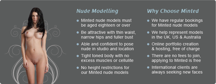 Minted are excellently positioned to help launch your career as a Nude model. Bookings can include artistic nude studio photograhy, for a variety of uses, together with live art modelling sessions at universities, art clubs, and suchlike, where a private changing area will always be provided. There are many nude model requirements and we have bookings available now in the jobs section with clients constantly seeking experienced models together with new faces. Create your free profile and you can apply for our nude castings immediately.